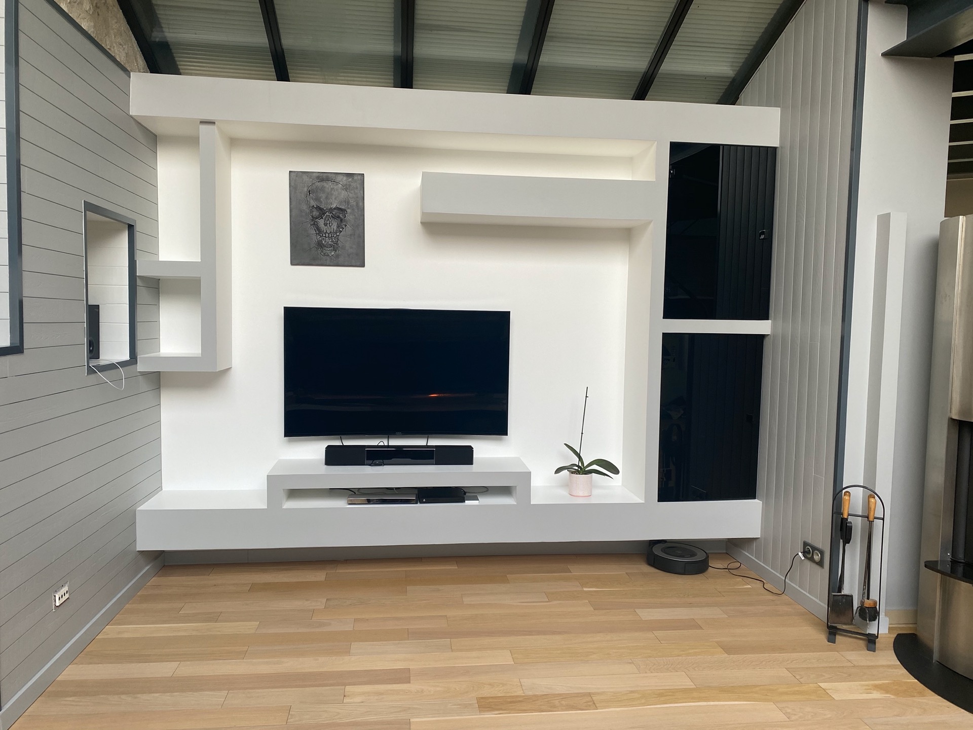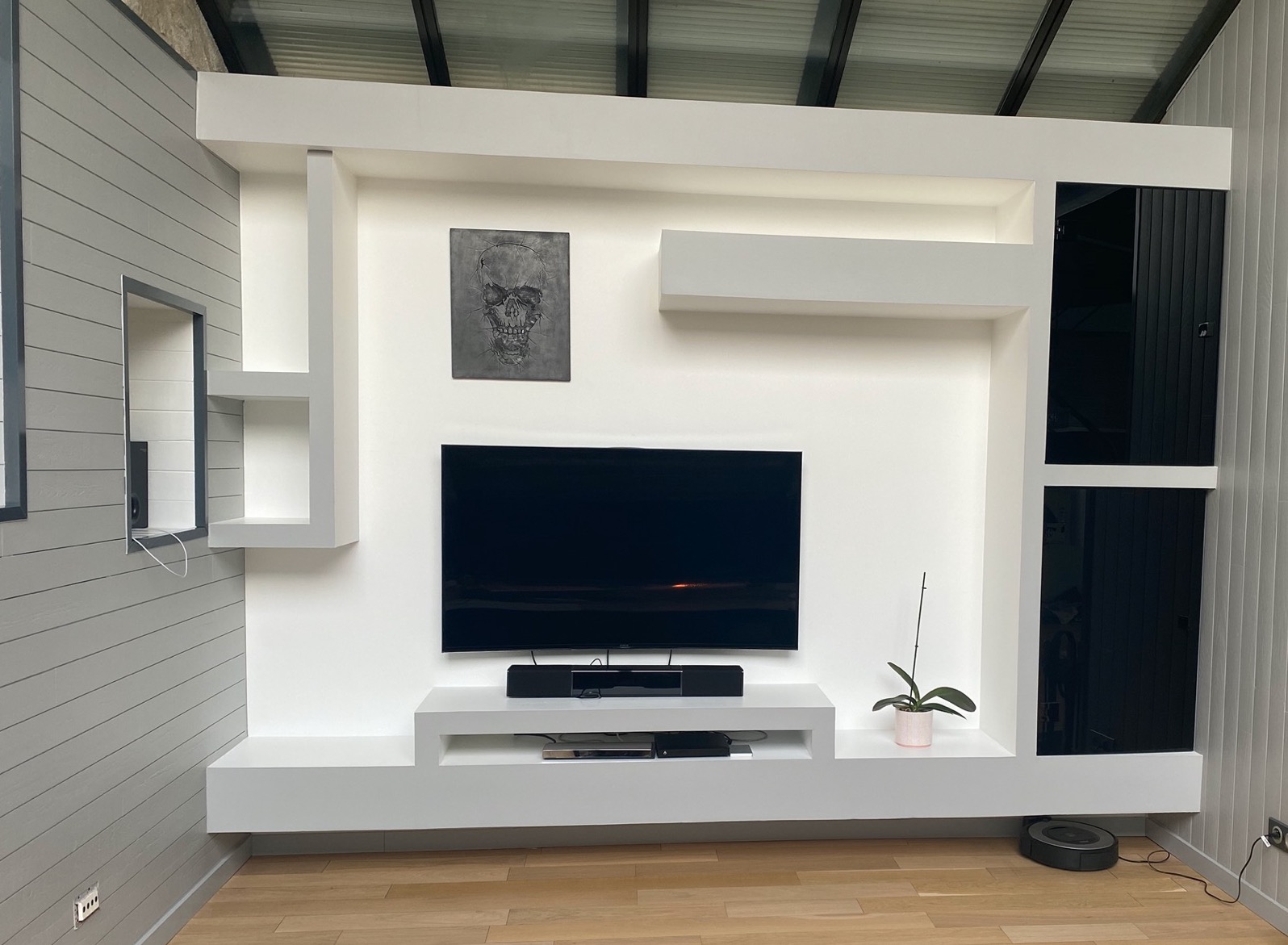 Rénovation dans une maison avec un meuble télé moderne fait exclusivement en plaque de plâtre et peinture sur mesure et selon les souhaits du client.