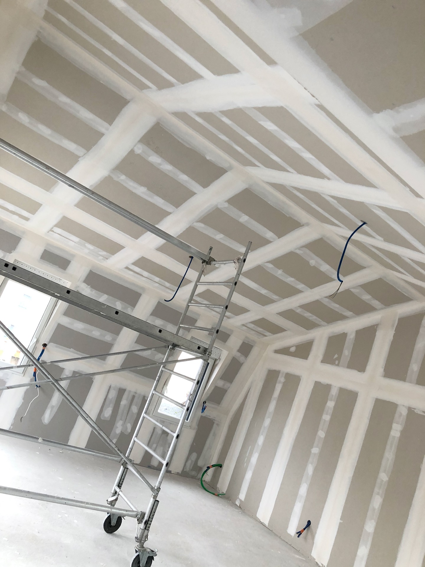 Bandes faites avec un échafaudage après la pose de plaque de plâtre fait précédemment